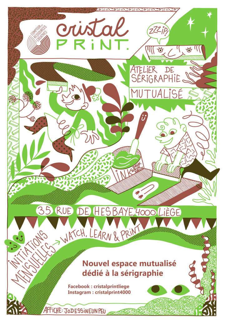 Affiche pour l’atelier de sérigraphie Cristal Print, 2021Commande pour le magazine Imagine Demain le Monde, 2021Illustration réalisée pour le calendrier 2022 de l’asbl La Nouvelle Poupée d’Encre, 2021